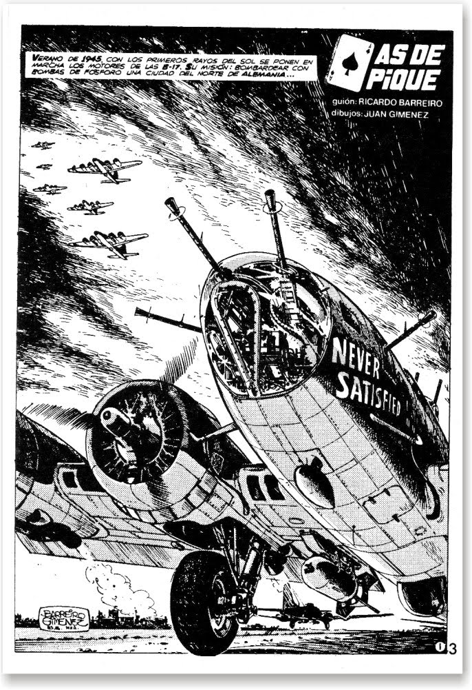 Y es en este escenario donde se desarrolla As de Pique, serie creada por el guionista argentino Ricardo Barreiro y dibujada por su compatriota Juan Giménez. La serie supuso, no sólo el espaldarazo definitivo para la carrera de Giménez, sino la demostración, además, de que el hombre y la máquina podían compartir protagonismo en las páginas de un cómic sin que ninguno de ellos se resintiera. Giménez nos sumerge en un mundo donde los aviones -cada vez más sofisticados y destructivos- se enfrentan al espíritu de supervivencia de los seres humanos en medio del sinsentido que es la guerra.