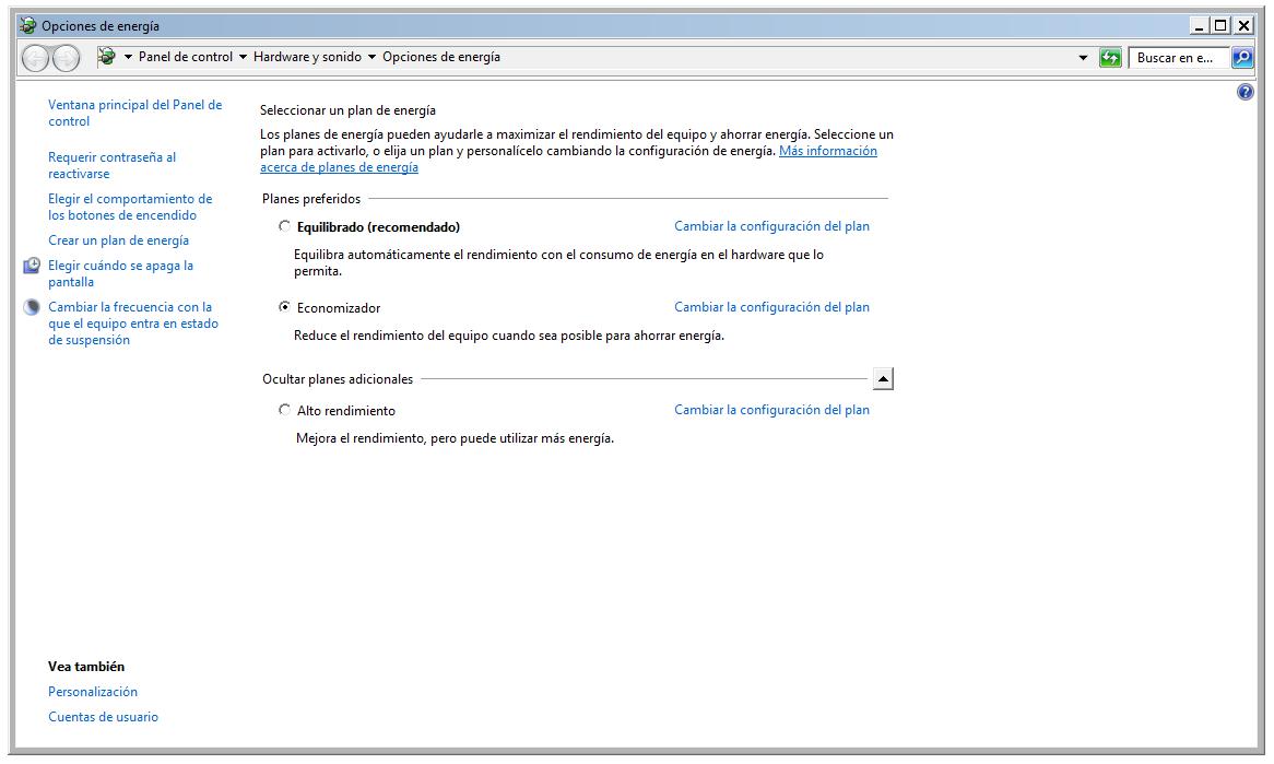 Reconfigura las opciones de energía de tu PC. Para ello pincha en Inicio y en el campo de “Buscar programas y archivos” escribe powercfg.cpl y reconfigura todas las opciones de rendimiento a un modo economizador y de ahorro de energía.