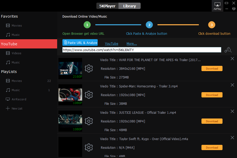 Además de trabajar como un reproductor de medios para Windows 10, 5KPlayer es también un descargador de videos de YouTube que te permite descargar video y música de calidad 4K / 8K / HD de más de 300 sitios, incluyendo YouTube, Dailymotion, Vimeo, Vevo, Facebook, Soundcloud, etc.
